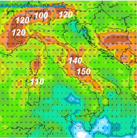 Segnaliamo 140-150mm nelle aree interne dell’Appennino centro-meridionale; 100-120 mm sulle Alpi, 110 mm nel nord della Sardegna.