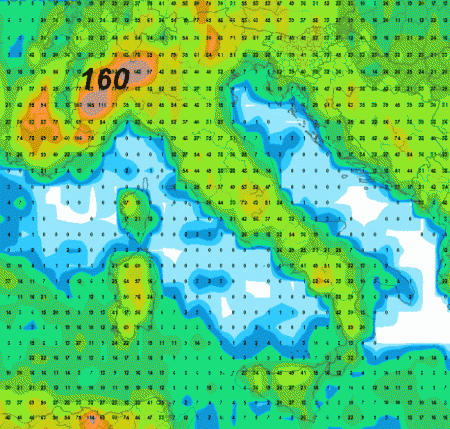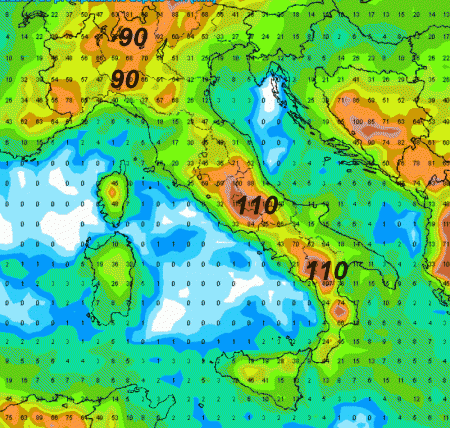 Punte di 110mm nelle aree interne del centro e del meridione, 90mm sulla Lombardia.