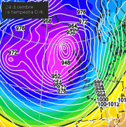 (che transiterà poco al largo delle coste settentrionali irlandesi fino a lambire quelle settentrionali scozzesi) di 930hPa tra le 06 e le 15 della Vigilia, vento medio da sud-ovest fino a 130km/h oltre a raffiche fino a 150km/h, onda media da sud-ovest a ridosso delle coste irlandesi 15 metri e mezzo!