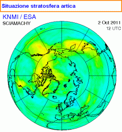 Come avviene ogni primavera, la stratosfera antartica vede una riduzione anche fino all'80% dell'ozono normalmente presente. Anche la stratosfera artica presenta lievi anomalie ma la situazione è sotto controllo.
