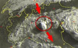 Nella prima immagine notiamo il cielo minaccioso di Desenzano (Brescia), nella seconda l’inquadratura da satellite del medesimo ammasso nuvoloso.