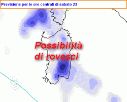 Tra venerdì 22 e sabato 23 la parte periferica di una perturbazione in avvicinamento parziale dalle Isole Baleari darà luogo dunque in Sardegna allo sviluppo di rovesci. Nella giornata di sabato sarà inoltre possibile anche qualche temporale, in particolare su Cagliaritano e Nuorese, come evidenziato nella mappa riportata in figura e riferita alle ore centrali della giornata.