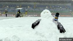 Sotto il pupazzo di neve scherzosamente posto dai tifosi sul campo di Parma, mentre l’ultima immagine in basso mostra le condizioni serali del campo di Bergamo, dove il match è stato in forse sino all’ultimo momento.