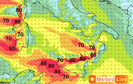 I numeri sottintendono la velocità del vento espressa in km/h. Come vedete, si potranno toccare punte di 80km/h sulla Sardegna sud-occidentale, le bocche di Bonifacio, l’ovest della Corsica, lo Stretto di Sicilia, sulla Sicilia settentrionale e sulla Calabria Tirrenica.
