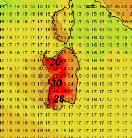 Il caldo interesserà soprattutto il settore occidentale dell’Isola con punte di 28-30°. Sul settore orientale avremo temperature più basse, così come sull’intera Penisola (anche se sabato sarà la giornata più calda della settimana, ma senza esagerare).