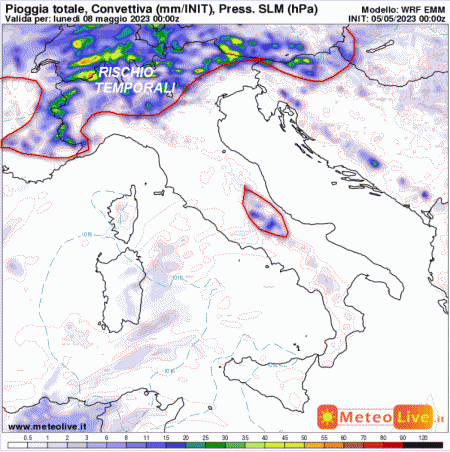 Di seguito, la mappa delle precipitazioni convettive (temporali) prevista fino alla mezzanotte su lunedi 8 maggio
