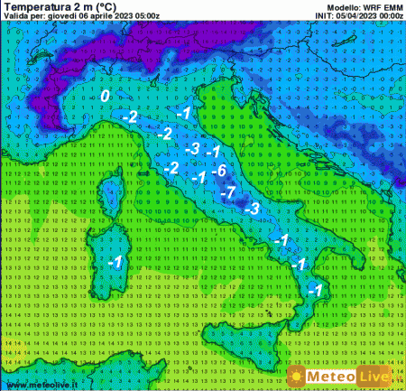 Nelle valli incassate tra Lazio e Abruzzo si potrebbe arrivare fino a -6/-7°, ma valori sottozero saranno possibili anche sulla Toscana e l’Umbria (tra -1 e -2°). Deboli gelate anche nelle aree interne della Sardegna e nelle aree interne di Calabria e Campania (-1°).