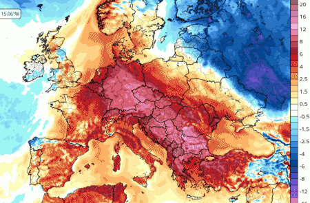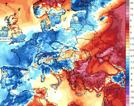 E’ evidente il tracollo termico su tutta l’Europa centro-occidentale oltre al nord e al centro Italia dove saranno presenti valori sottomedia. La massa di aria calda dovrebbe spostarsi più ad est, in direzione del Mar Nero e la Turchia.