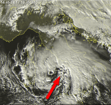 Ecco in bella mostra il ciclone mediterraneo che in queste ore si sta potenziando sul basso Tirreno. Raggiungerà l’apice della sua potenza tra questa sera e la prossima notte, arrivando alla ragguardevole pressione di 990 mb!