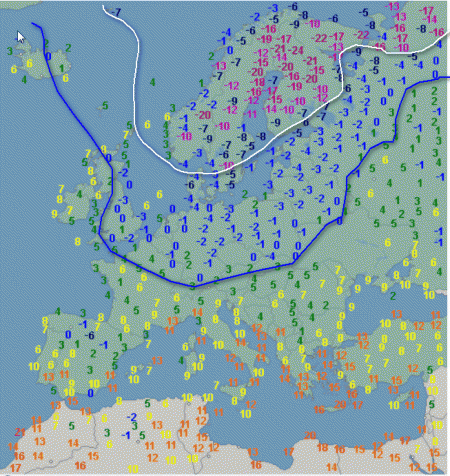 Il gelo fa da padrone a nord della linea bianca ed in misura minore a nord della linea blu. Tra la Svezia e la Scandinavia le temperature scendono di notte fino a -20/-21° in alcune aree, escludendo ovviamente la fascia costiera norvegese.