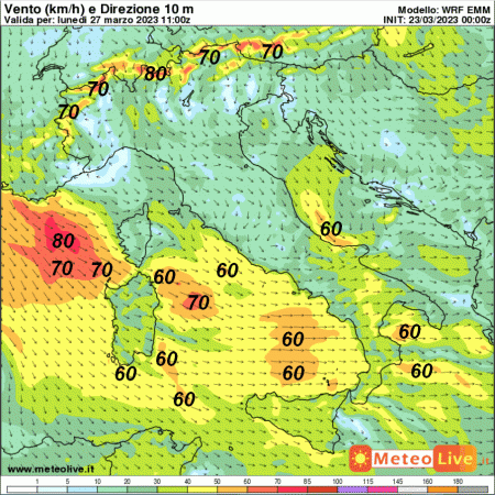 Ecco la mappa eolica prevista sull’Italia per le ore centrali di lunedi 27 marzo, attorno alle ore 13: