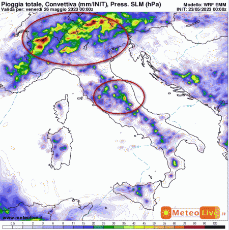 Come si può notare dalla mappa valida fino alla mezzanotte su venerdi 26 maggio mostra le probabilità maggiori su Alpi, Prealpi, alte pianure e zone interne dell’Italia centrale.