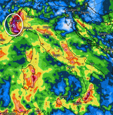 Notiamo ancora tanta pioggia sull’Italia, ma spicca su tutti il dato del Piemonte occidentale: ben 245mm previsti sulla zona dal modello in questione!