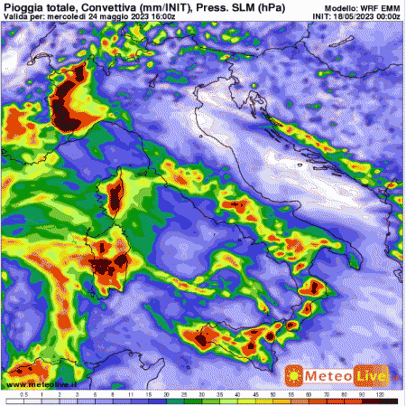 Di seguito, la sommatoria delle precipitazioni convettive (rovesci o temporali) che si avranno in Italia fino a metà della settimana prossima, mercoledi 24 maggio: