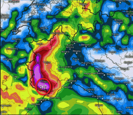 Questa mappa mostra una cumulata piovosa di 247mm in prossimità del Cuneese fra sabato e domenica. Proprio il Cuneese rischia di essere l’area maggiormente colpita dalle criticità! Prestare quindi la massima attenzione.