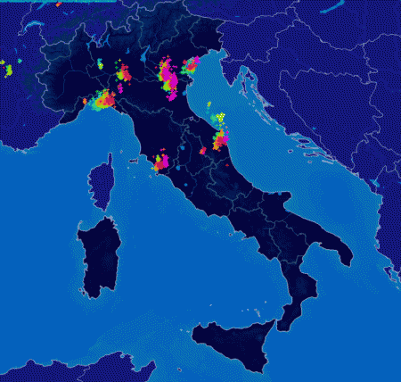 Di seguito, la mappa delle fulminazioni in Italia alle ore 16 di oggi, giovedi 13 aprile: