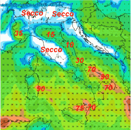 Pioverà invece in maniera egregia sulla Puglia (70-90mm), tra la Sicilia nord-orientale e la bassa Calabria (70-75mm) e sulla Sardegna orientale (90mm).