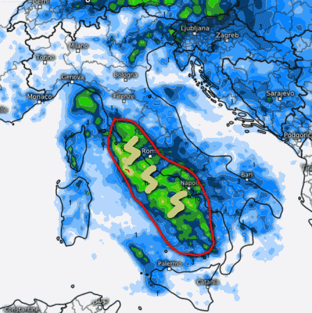 Saranno probabili quindi colpi di tuono tra la bassa Toscana, il Lazio, la Campania e poi giù fino alla Calabria Tirrenica e al nord della Sicilia (segnatamente il Messinese). Non escludiamo la possibilità di grandinate e colpi di vento.