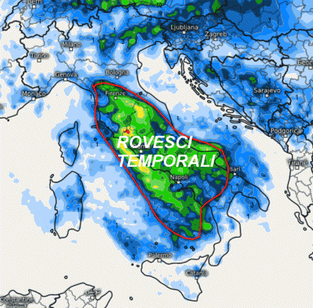 Avremo il rischio di temporali anche forti nella zona racchiusa nella linea rossa, ovvero la bassa Toscana, il Lazio, l’Umbria, l’Abruzzo, il Molise e la Campania. Al nord situazione in miglioramento con qualche rovescio al nord-est. Interessate poco invece la Sardegna e la Sicilia.
