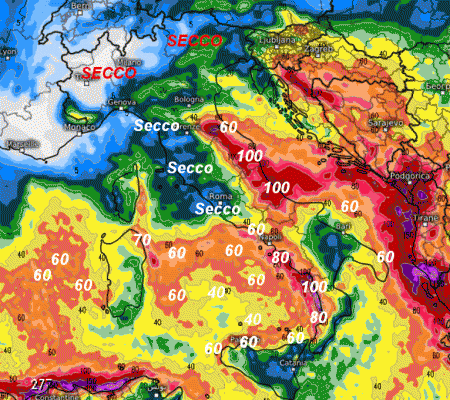 Fino a 100mm tra Marche e Abruzzo, con circa 1 metro di neve sul retrostante Appennino. 80-100mm saranno possibili anche tra Cilento e Calabria Tirrenica. 70mm sulla Sardegna orientale, 60mm sul nord della Sicilia, Sardegna occidentale e Salento.
