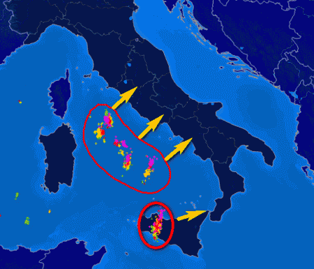 Altri temporali sono situati nel Tirreno e tendono a risalire verso nord-est come mostrano le frecce. Nelle prossime ore fenomeni temporaleschi saranno quindi possibili sul Lazio e la Campania. Stamattina c’è stato anche qualche temporale sulla Sardegna, anche se al momento l’isola è esente da fenomeni temporaleschi.