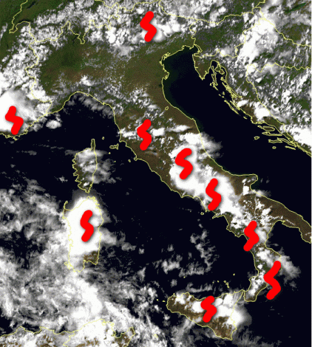 Le macchie bianche sono i temporali più forti. Stanno colpendo la Sardegna, le aree interne del centro e del meridione, la Sicilia e le Alpi orientali. Qualche temporale è presente anche sulla bassa Toscana.