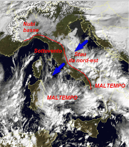 La Liguria, il nord-est e l’alto/medio versante tirrenico presentano cielo sereno o poco nuvoloso semplicemente perchè l’Appennino alle loro spalle sta operando un’azione di sbarramento nei confronti dei corpi nuvolosi in arrivo dall’Europa orientale.