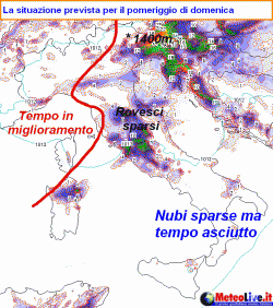 Che giornata sarà domenica? Una giornata complessivamente un po' incerta, con passaggio di rovesci su nord-est e centro. Migliora al nord-ovest già dalla tarda mattinata, mentre al sud si avranno solo nubi di passaggio ma poche precipitazioni.