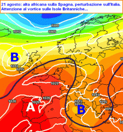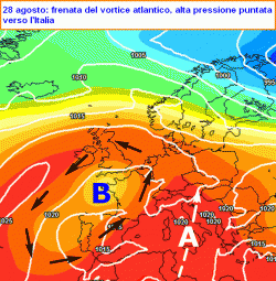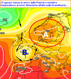 Le vicende atmosferiche però non finiscono qui: proprio l’esuberanza del canale anticiclonico afro-iberico, andrà ad allungarsi con una repentina manovra di stretching fin sul Regno Unito (venerdì 23) e addirittura sulla penisola Scandinava (domenica 25). Tanto basterà a permettere l’inserimento di un vortice di bassa pressione dal nord Atlantico verso l’Europa centro-occidentale intorno a lunedì 26 agosto.