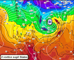 Nella mappa in alto il movimento spiarliforme delle masse d’aria intorno al vortice descritto.