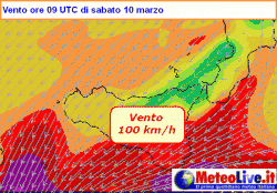 La prima mappa allegata, e riferita alle ore centrali della giornata di sabato 10 marzo, conferma graficamente quando descritto. Qui a fianco il vento fino a 100 km/h previsto sulla Sicilia meridionale nella stessa giornata.