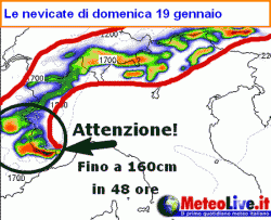 Domenica 19 altra passata di bianco. Attenzione alle Alpi Marittime e Cozie, dove sono previsti cadere ulteriori 60-70 centimetri di neve che, sommati agli 80-90 della giornata precedente, fanno 140-160 centimetri di neve nell’arco di 48 ore. Il concomitante lieve rialzo delle temperature, dovute al subentro in quota di venti sciroccali, contribuirà senz’altro a instabilizzare l’immane massa nevosa.