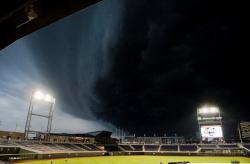 Nello stesso giorno, anzi la stessa sera, un altra impressionante struttura temporalesca ha seminato il panico nei cieli della località Omaha, seconda immagine. La grandinata che è seguita ha imbiancato il campo sportivo dove si doveva disputare l’incontro tra Florida e Vanderbilt.