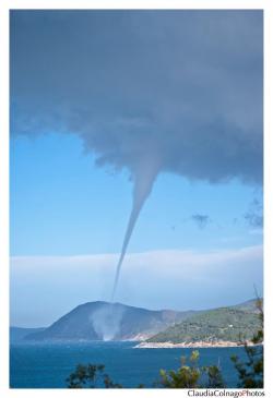 Una tromba marina lunga ed esile prende vita dalla base del cumulo andando a schiantarsi contro la costa nelle vicinanze di Portoferraio. (Isola d’Elba)