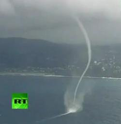 La sequenza mostra una tromba marina ripresa dal cielo. Complimenti all'intraprendente e coraggioso pilota del velivolo che ci ha permesso di assaporare questo emozionante spettacolo della natura.