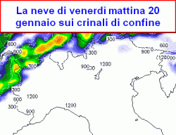 NEVE di VENERDI 20 gennaio: è attesa soprattutto sui crinali di confine dall’alta Valle d’Aosta, alla Formazza, al Livignasco, sino all’alta Venosta, alla zona Brennero e alla Valle Aurina e Pusteria, con possibile coinvolgimento anche del Tarvisiano e dell’alto Cadore, zona di Sappada. Limite sui 700-800m in calo dalla sera sino ai fondovalle.