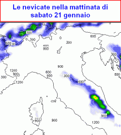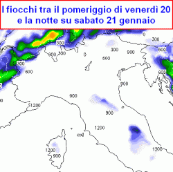 NEVE di SABATO 21 gennaio mattino: continuerà a nevicare sui crinali alpini di confine, soprattutto tra il Brennero e la valle Aurina, nevicherà in modo a tratti abbondante sui rilievi romagnoli, marchigiani e abruzzesi sopra i 200-300m, fiocchi anche sul Casentino in Toscana, temporanee e sporadiche nevicate potranno interessare anche i settori più orientali dell’Umbria e il Reatino.