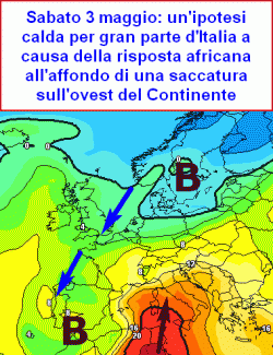 Potrebbe accadere sabato 3 se la saccatura in discesa dal nord Atlantico finisse per sprofondare ad ovest, isolando una goccia fredda sull’Iberia e lo schema potrebbe ripetersi mercoledì 7 maggio, davanti ad una saccatura