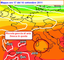 Tutto è partito da una piccola goccia di aria fresca rilevata solo dalle mappe in quota e posizionata tra le nostre Isole Maggiori. La posizione è ben individuata dalla sinottica che abbiamo allegato nella figura in alto.