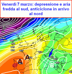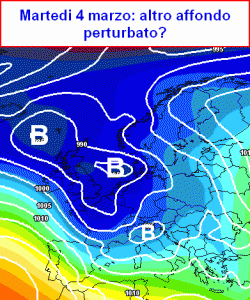 Una stretta saccatura interverrebbe tra lunedì e martedì portando una scarica di rovesci e anche un minimo transitorio al suolo in viaggio dal settentrione al medio Adriatico ed anche alcune nevicate a bassa quota dapprima sulle Alpi e poi in Appennino.