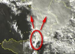 Dall’immagine satellitare appare come un lungo pennacchio bianco, che sembra generarsi dal nulla. E’ il temporale autorigenerante che sta ancora flagellando la Sicilia nord-orientale e la Calabria, con accumuli che in alcuni casi hanno sfiorato i 300mm.