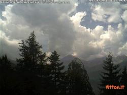 L’immagine della web cam mostra la situazione nella località piemontese di Sauze d’Oulx, circa 1509 metri di quota nelle Alpi occidentali. L’immagine è puntata verso sud-est in direzione della pianura torinese, e sono ben visibili alcuni grossi cumuli congesti che si elevano sfruttando i pendii ripidi ed assolati che fungono da trampolino di lancio per le cosiddette "termiche".