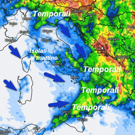 Al SUD temporali anche forti in transito sulle regioni estreme da ovest verso est, seguiti da schiarite. L’aria fresca in arrivo da nord-ovest manterrà comunque condizioni instabili per l’intera giornata con rischio di ulteriori rovesci specie nelle aree interne.