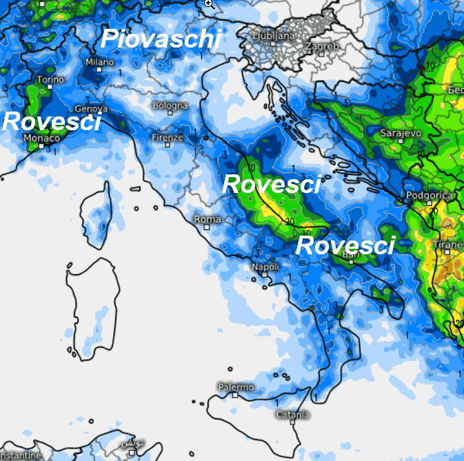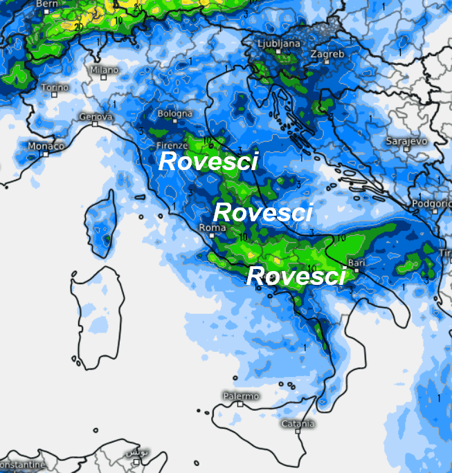 Gli acquazzoni ed i temporali interesseranno segnatamente le regioni centrali e parte del meridione, con quota neve attorno a 1200-1400 metri in Appennino. Qualche rovescio non si esclude anche sull’Emilia Romagna, mentre al nord, sulle Isole e all’estremo sud la situazione meteo sarà migliore con rischio di rovesci più basso.