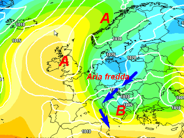 Sembra una situazione invernale a tutti gli effetti. Alta pressione forte in sede inglese ed aria fredda ed instabile sull’Italia e sull’Europa centro-orientale. Il tempo atteso in Italia con una configurazione del genere non potrà che essere “capriccioso” con rischio di acquazzoni e nevicate in Appennino a quote non troppo elevate.