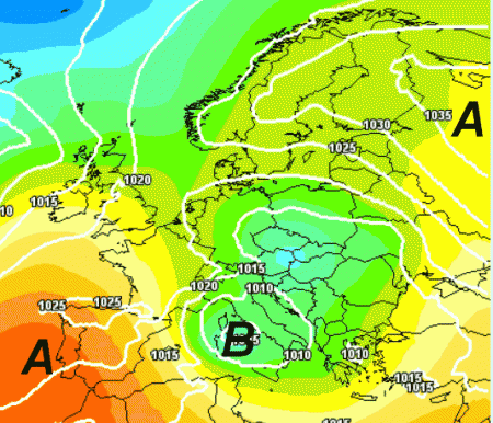Notiamo due aree anticicloniche ai lati ed una bassa pressione nel mezzo, proprio sul Mediterraneo. Con questa situazione, il tempo del prossimo fine settimana in Italia non potrà essere stabile, ma spesso accompagnato da piogge e rovesci, in un contesto termico fresco.