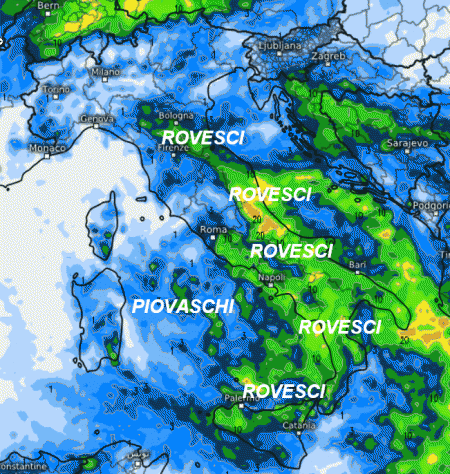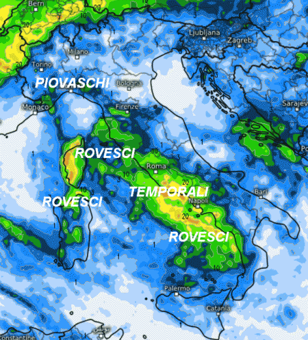 Notiamo un grappolo di rovesci o temporali tra la Toscana, l’Umbria occidentale, il Lazio e soprattutto la Campania. Rovesci anche sulla Sardegna ed in Calabria. Più a nord interverranno dei piovaschi soprattutto sul nord-ovest nell’arco della giornata, mentre sul nord-est il tempo sarà migliore.