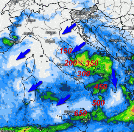 La nostra Penisola seguiterà a trovarsi sotto il tiro delle correnti fredde di matrice orientale. Le aree più esposte a questo tipo di circolazione saranno le centrali adriatiche, le aree interne e le regioni meridionali. Sarà proprio su queste zone che avremo il tempo peggiore,