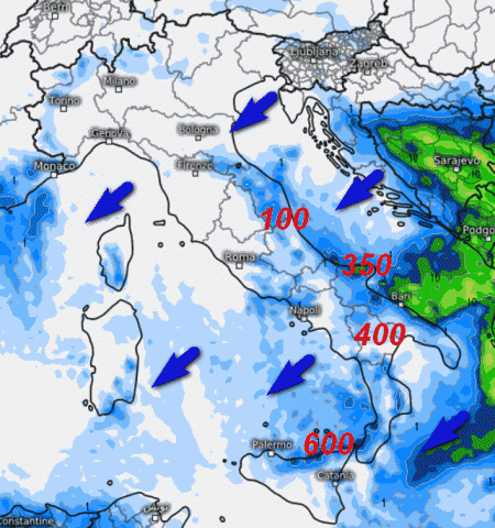 Ancora venti freddi da est: neve sopra i 100 metri tra Marche e Abruzzo, 350 metri sulla Puglia Garganica, 400 metri tra Irpinia, Lucania e Calabria, 600 metri sulla Sicilia. In giornata di fenomeni si dovrebbero attenuare.