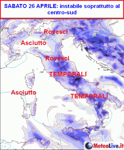 La prima cartina che vedete assomma le precipitazioni che cadranno in Italia dalle 8 alle 20 di sabato 26 aprile. Come potete vedere, i fenomeni saranno più presenti al centro-sud ed in modo particolare nelle zone interne.